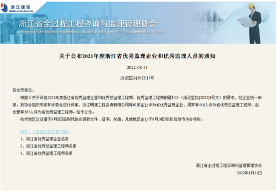 2022年8月31日,浙江省全过程工程咨询与监理管理协会下发《关于公布2021年度浙江省优秀监理企业和优秀监理人员的通知》浙咨监协[2022]17号文,根据《关于评选2021年度浙江省优秀监理企业和优秀总监理工程师、优秀监理工程师的通知》(浙咨监协[2022]8号文)要求,省协会组织专家和评委会进行评审,并经公示,全省61家企业评为省优秀监理企业、416人被评省优秀总监理工程师、367人评为省优秀监理工程师
